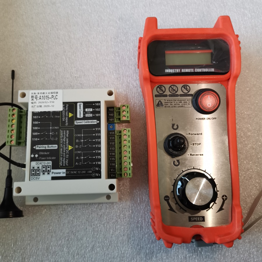 $ 遙控器手持機體積小,采用鈕子開關和大旋鈕速度調節,方便工人單手戴手套操作。