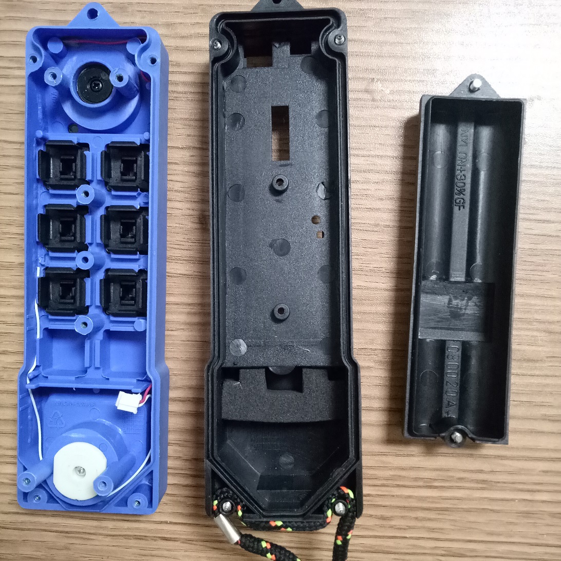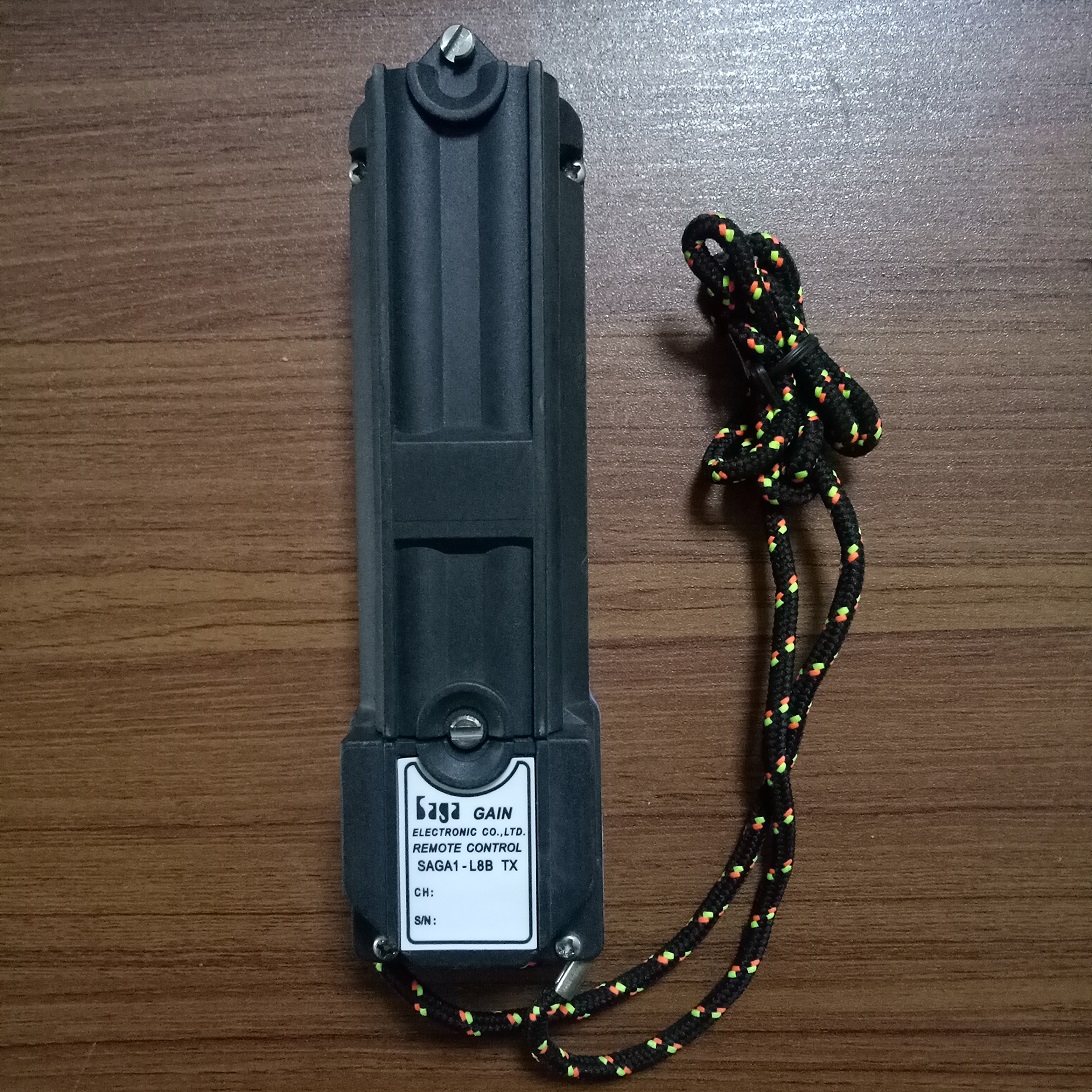 供應臺灣沙克SAGA1-L8B工業遙控器發射器外殼,遙控器手柄外殼。型號:SAGA1-L8B TX,包含蘑菇頭急停、啟動按鍵、外殼帶文字的按鍵、電池蓋、掛繩。電池盒可以裝配兩節5號電池。