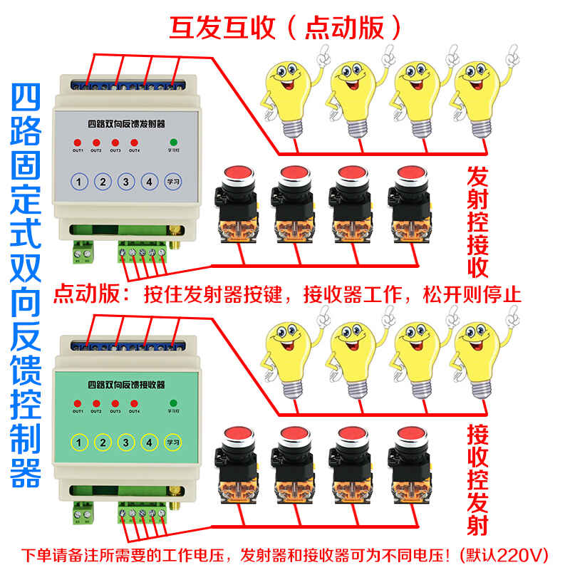 四路雙向無線控制器,兩只為一對,每只均具有發射和接收功能。 四路無線遙控開關,開關信號無線傳輸模塊,采集點對點IO信號,水塔霧炮雙向反饋遙控器。特別適用于控制柜、操作臺之間的開關控制信號無線傳輸。傳輸距離遠。每套包含兩只遙控器,每只遙控器采用軌道安裝,端子接線。兩只遙控器同時都具有發射和接收功能。A遙控器發射信號,B遙控器接收并輸出繼電器開關接點。B遙控器發射信號,A遙控器輸出繼電器信號。同時,遙控器具有手動按鈕控制功能。