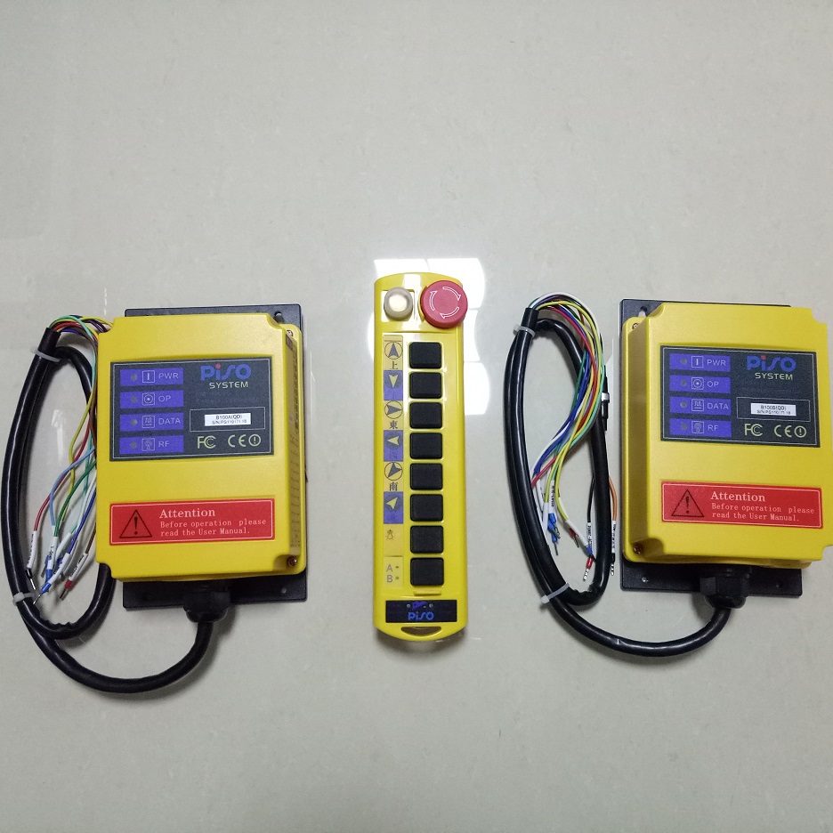 (QD型):單速6點型,加1只多功能功能鍵(可設A/B/A+B車功能),壓入/旋出急停鍵,距離100M,接收雙主機。