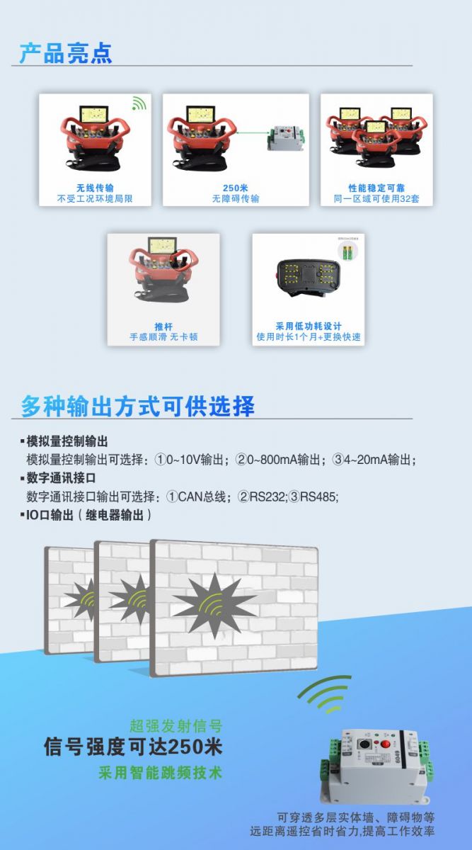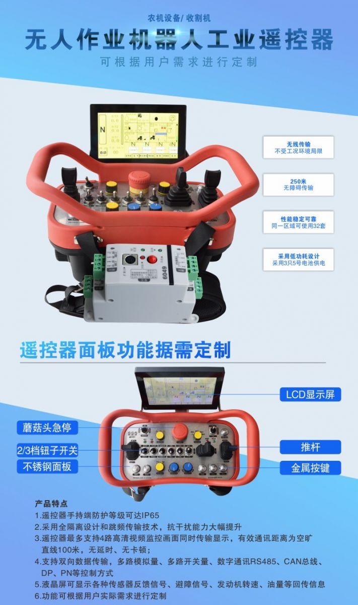 該系列產品應用于各種工農業機械設備,以上圖片只是客戶定制遙控器案例,圖片產品只能作為參考,具體控制功能、面板布局、操作形式、輸出形式等還需與技術溝通。